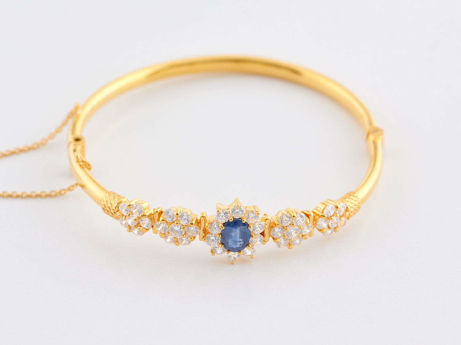 A SAPPHIRE AND CUBIC ZIRCONIA SET HINGE BRACELET IN 22CT GOLD, INNER DIAMETER 55MM, 15.36GMS
