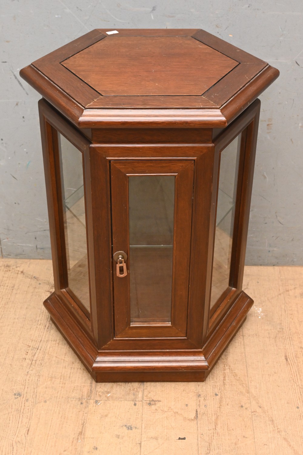 A VINTAGE TIMBER OCTAGONAL DISPLAY CASE ( 62H X 49H X 41D CM) (LEONARD JOEL DELIVERY SIZE: LARGE)