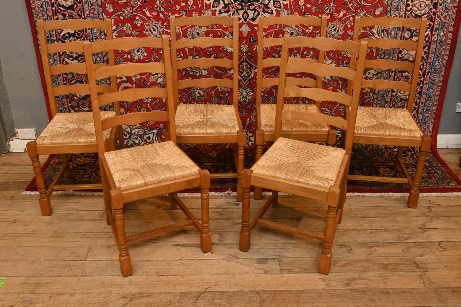 A SET OF SIX OAK LADDERBACK CHAIRS WITH RUSH SEATS ( 97H X 44W X 46D CM) (LEONARD JOEL DELIVERY SIZE: LARGE)