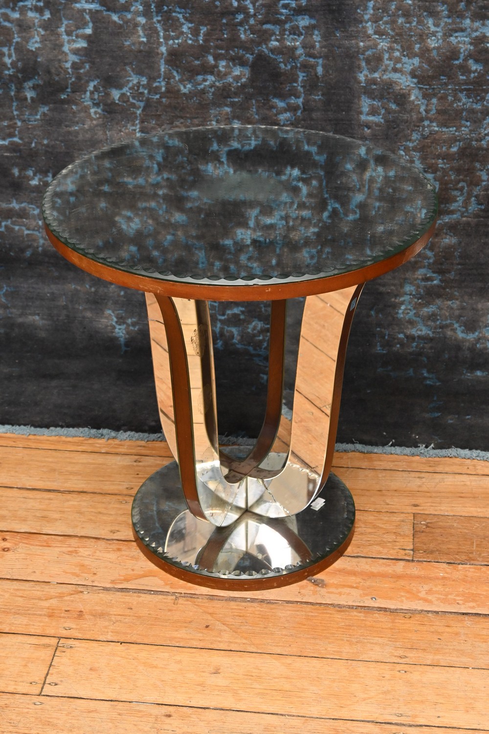 AN ART DECO SIDE TABLE WITH PIE CRUST EDGED GLASS (A/F) ( 51H X 50 DIAMETER CM) (LEONARD JOEL DELIVERY SIZE: MEDIUM)
