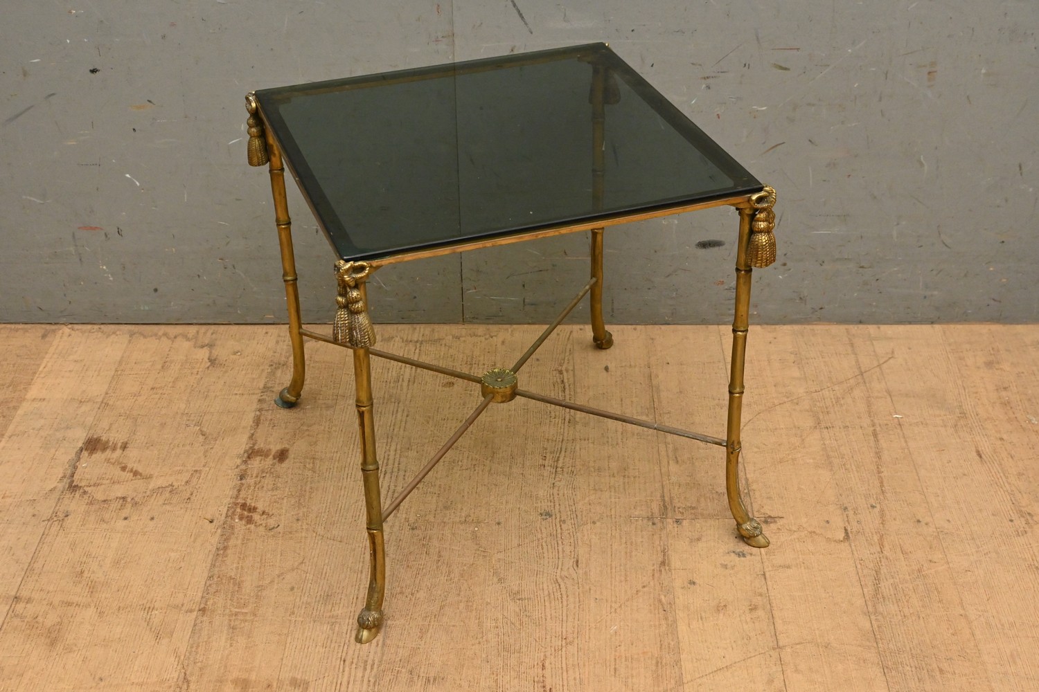 A BRASS AND GLASS CROSS BASED SIDE TABLE ( 47H X 51W X 51D CM) (LEONARD JOEL DELIVERY SIZE: LARGE)