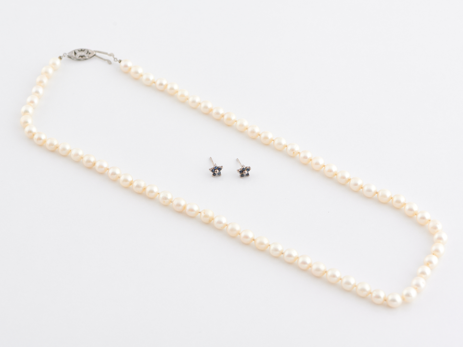 A CULTURED PEARL NECKLACE, LENGTH 540MM, AND A PAIR OF SAPPHIRE CLUSTER EARRINGS TO POST AND BUTTERFLY FITTINGS IN SILVER