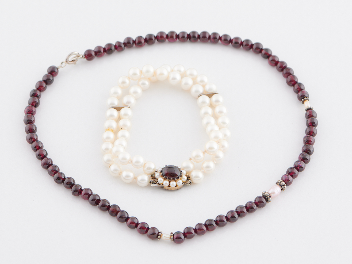 A GARNET AND PEARL DOUBLE STRAND BRACELET TO A CLASP IN 9CT GOLD, LENGTH 190MM, TOGETHER WITH A GARNET NECKLACE TO A SILVER CLASP, LENGTH 400MM