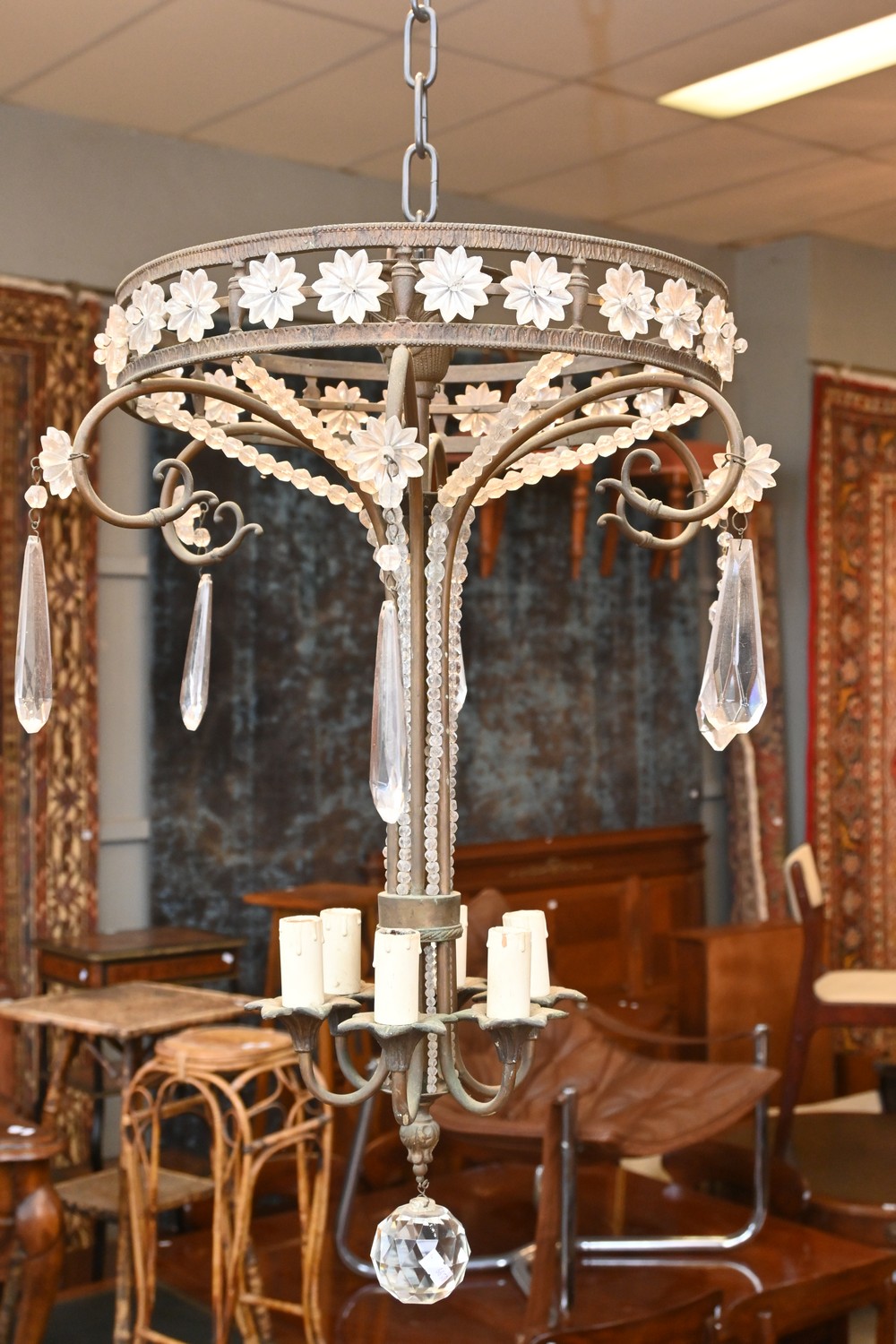 A 1970'S ITALIAN SIX BRANCH CRYSTAL CHANDELIER (A/F) ( 62CM X 45 DIAMETER CM) (LEONARD JOEL DELIVERY SIZE: LARGE)