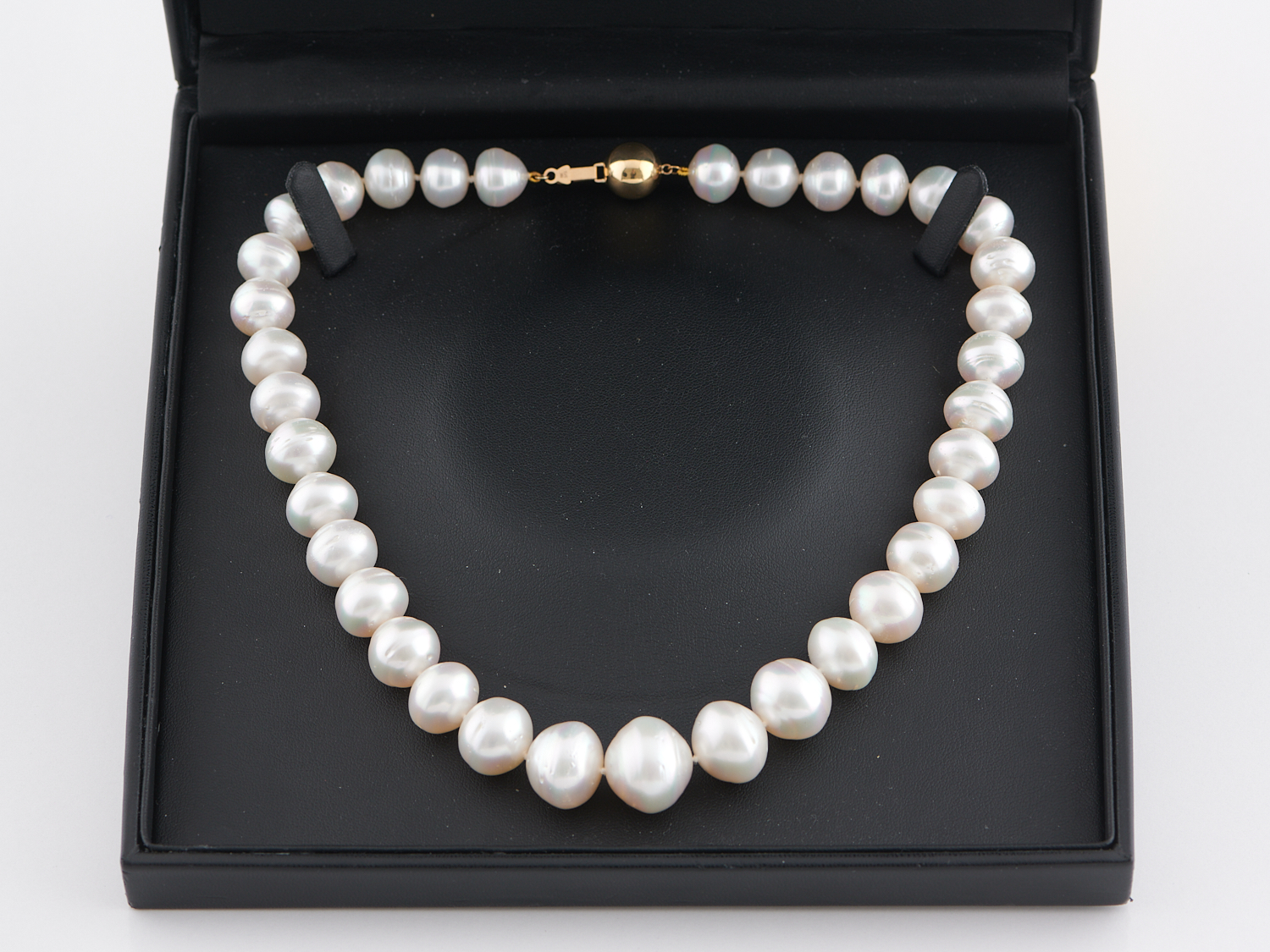 A SOUTH SEA PEARL NECKLACE TO A BALL CLASP IN 9CT GOLD, THE PEARLS MEASURING FROM 19MM TO 12MM, LENGTH 460MM, WITH BOX