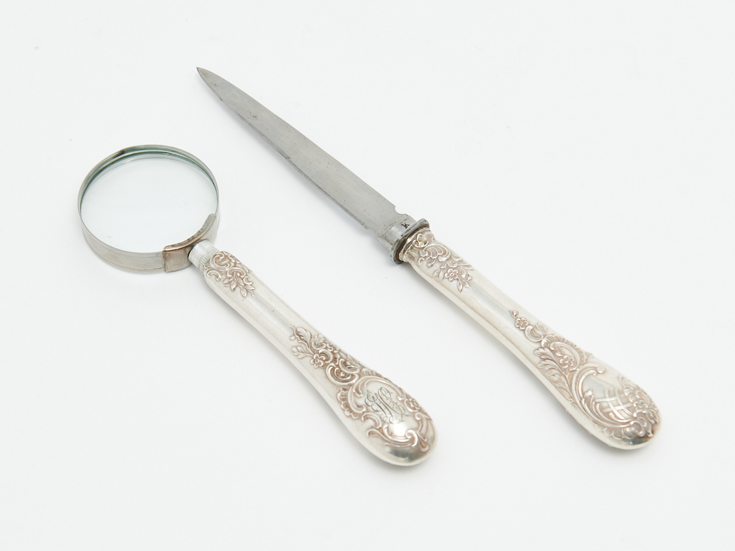 A SILVER HANDLED MAGNIFYING GLASS AND LETTER OPENER L.23 CM, LEONARD JOEL LOCAL DELIVERY: SMALL