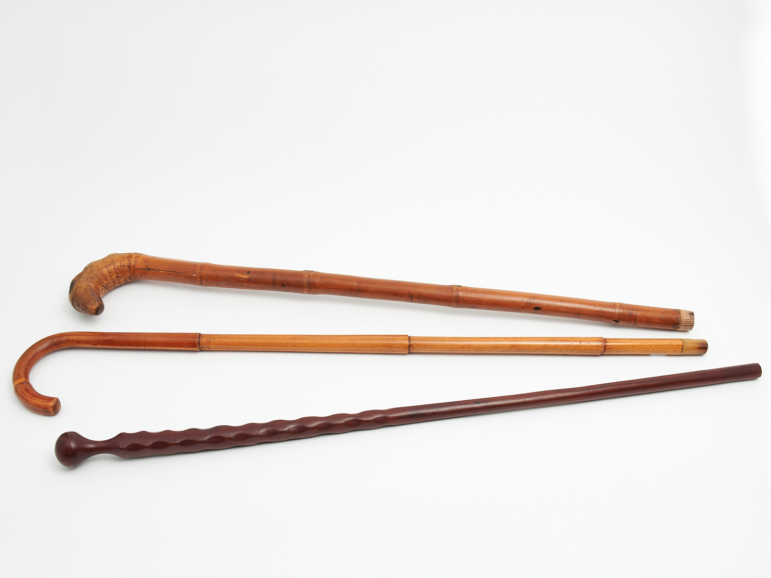 A GROUP OF THREE WOODEN WALKING CANES H.92 CM, LEONARD JOEL LOCAL DELIVERY: SMALL
