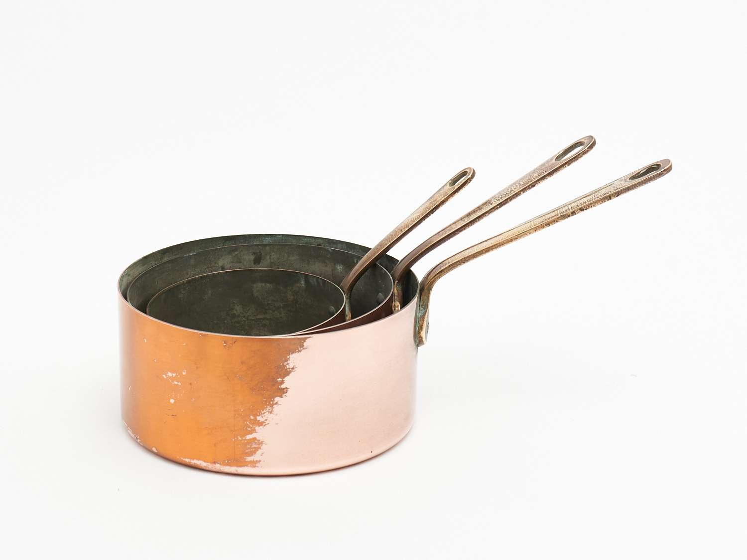 THREE COPPER PANS DIA.18.5CM (LARGEST), LEONARD JOEL LOCAL DELIVERY: MEDIUM