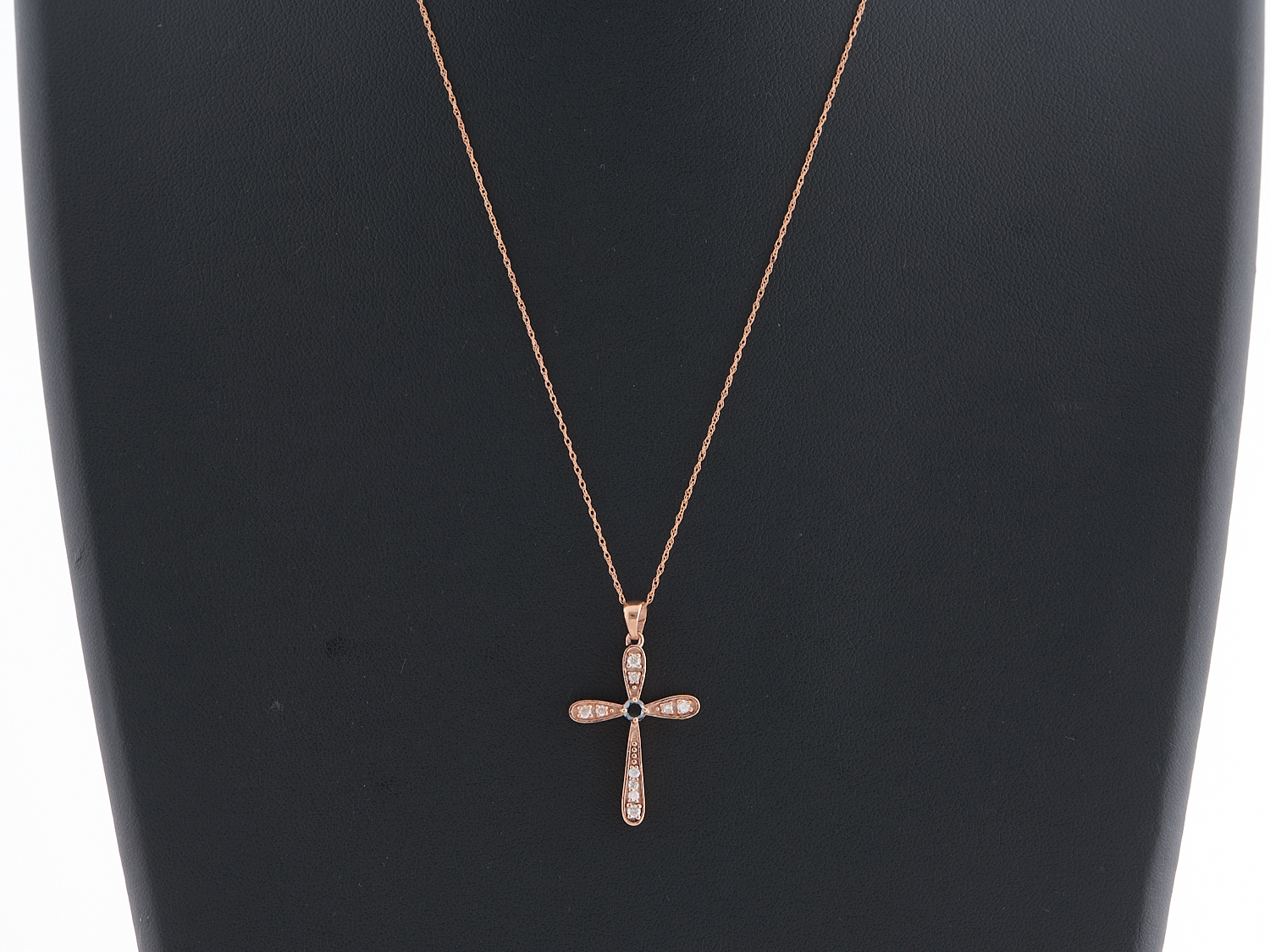 A BLACK DIAMOND AND DIAMOND CROSS PENDANT IN 10CT GOLD, LENGTH 28MM, TO A FINE TRACE CHAIN, LENGTH 46MM, 2.7GMS
