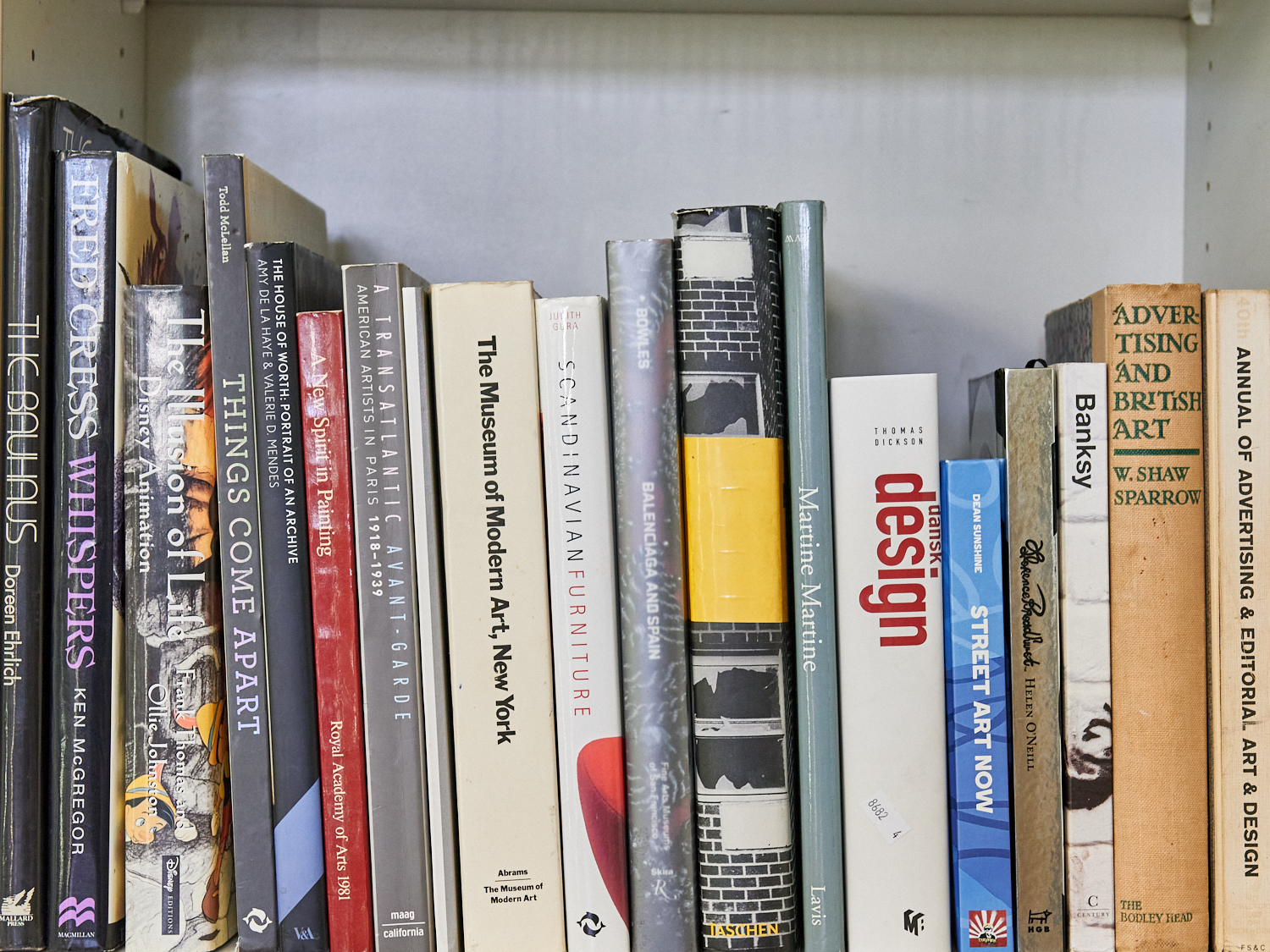 SHELF OF 20TH CENTURY ART AND DESIGN INCLUDING TOUMAC DICKSON "DANSK DESIGN", JUDITH GURA "SCANDINAVIAN FURNITURE", "TRESPASS; A HISTORY OF UNCOMMISSIONED URBAN ART" HELEN O'NEILL "FLORENCE BROADHURST", LEONARD JOEL LOCAL DELIVERY: MEDIUM