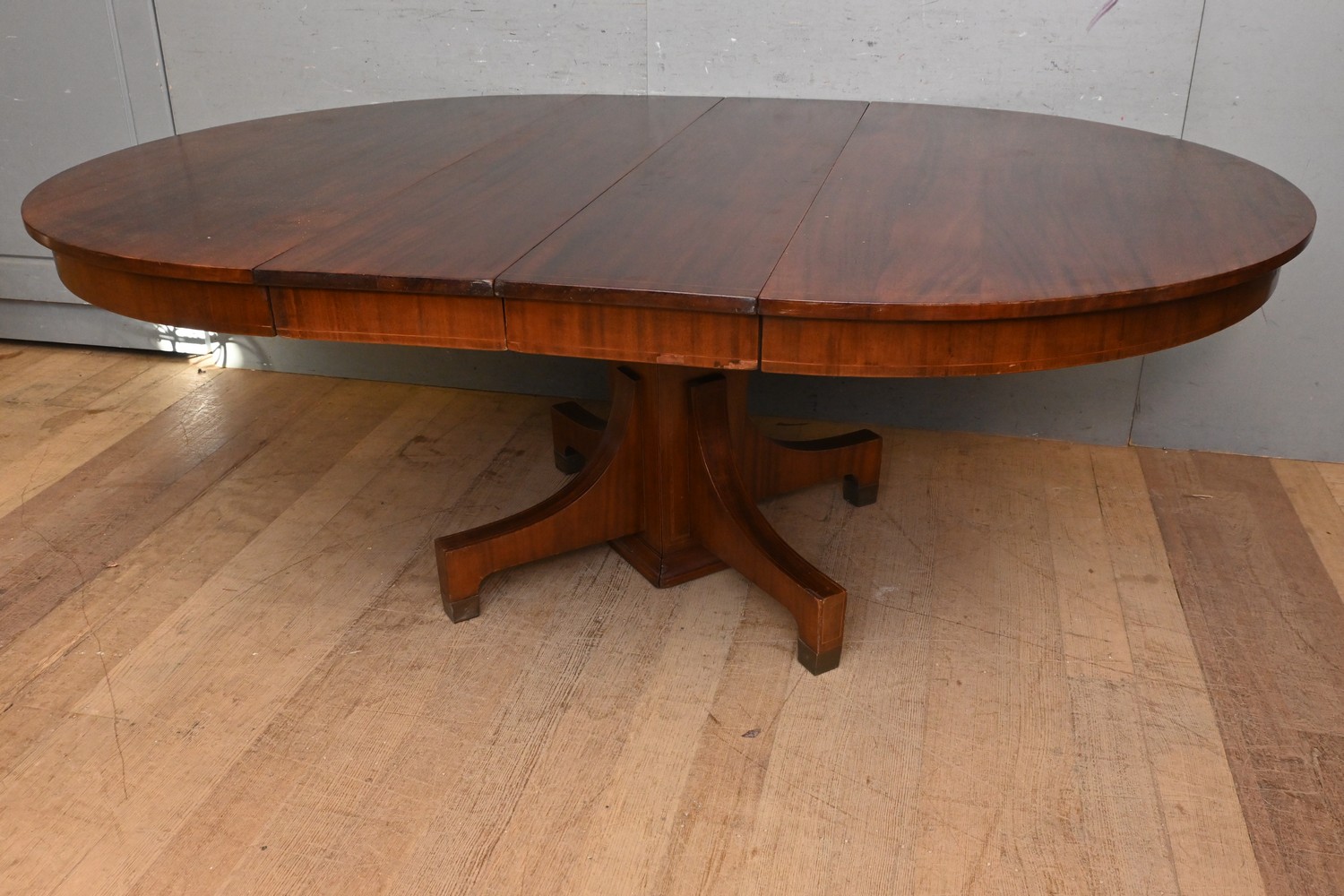 AN ART DECO MAHOGANY EXTENSION DINING TABLE ( 72H X 200W X 138D CM) (PLEASE NOTE THIS HEAVY ITEM MUST BE REMOVED BY CLIENTS OR CARRIERS AT THE CUSTOMERS EXPENSE. LEONARD JOEL STAFF CANNOT ASSIST CARRYING THIS ITEM)
