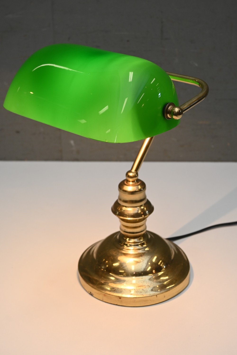 A BRASS AND GREEN GLASS BANKER'S LAMP (38H CM) (LEONARD JOEL DELIVERY SIZE: SMALL)