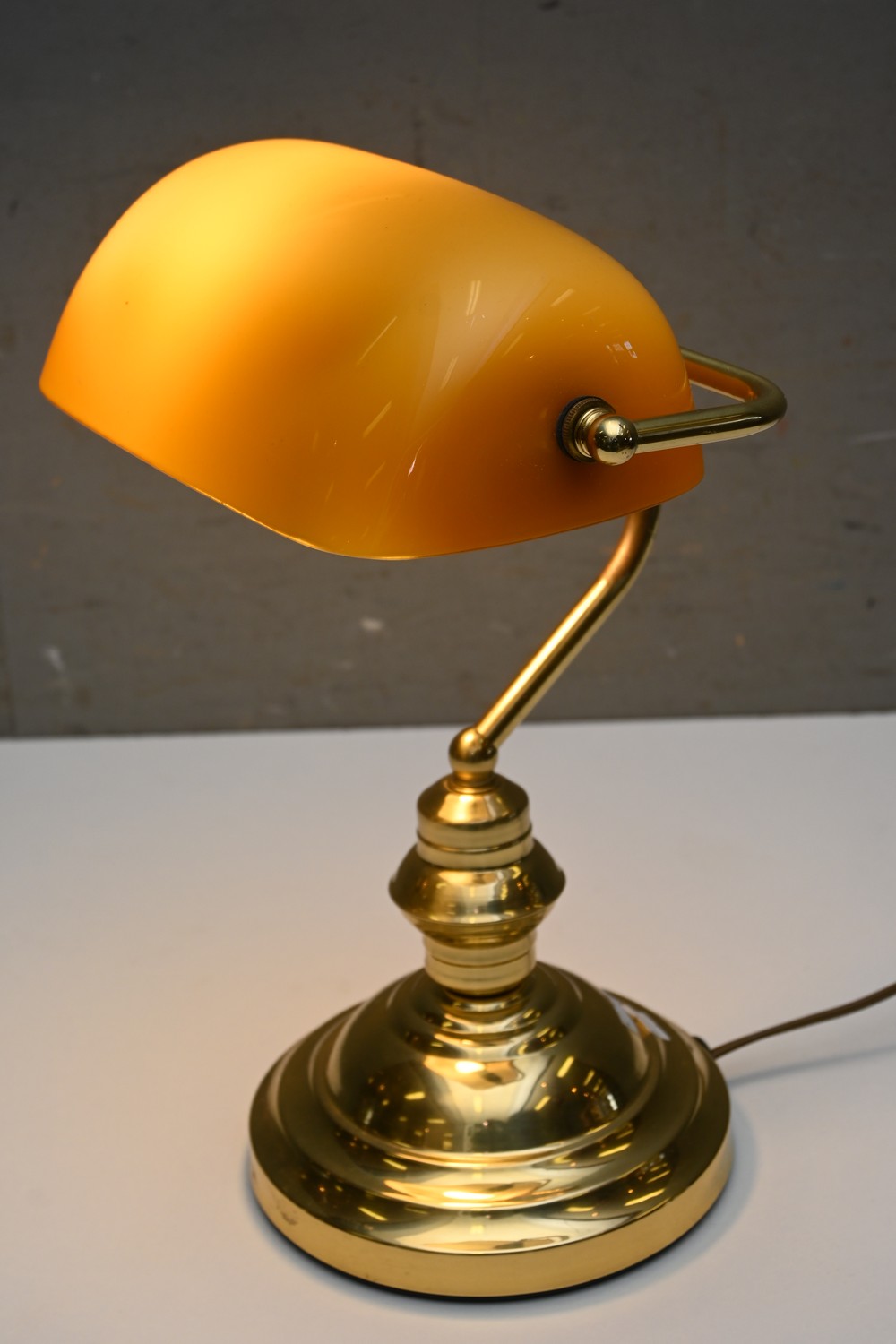 A BRASS AND YELLOW GLASS BANKER'S LAMP (38H CM) (LEONARD JOEL DELIVERY SIZE: SMALL)