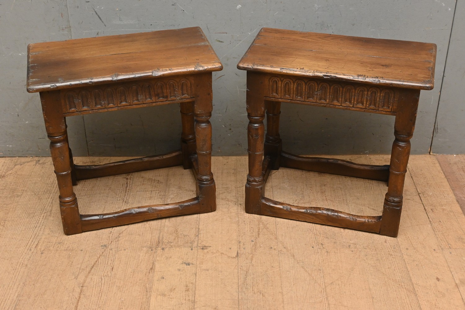 A PAIR OF 17TH CENTURY STYLE ENGLISH OAK STOOLS ( 46H X 49W X 29D CM) (LEONARD JOEL DELIVERY SIZE: LARGE)