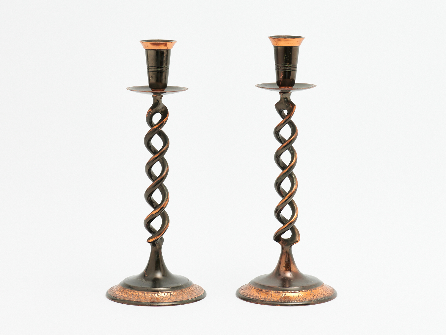 A PAIR OF PATINATED COPPER BARLEY TWIST CANDLESTICKS H.30CM, LEONARD JOEL LOCAL DELIVERY: SMALL