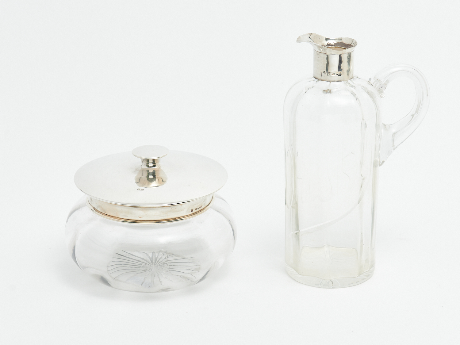 A STERLING SILVER LIDDED POWDER PUFF CONTAINER AND STERLING COLLARED WHISKEY DECANTER (A/F), LEONARD JOEL LOCAL DELIVERY: SMALL