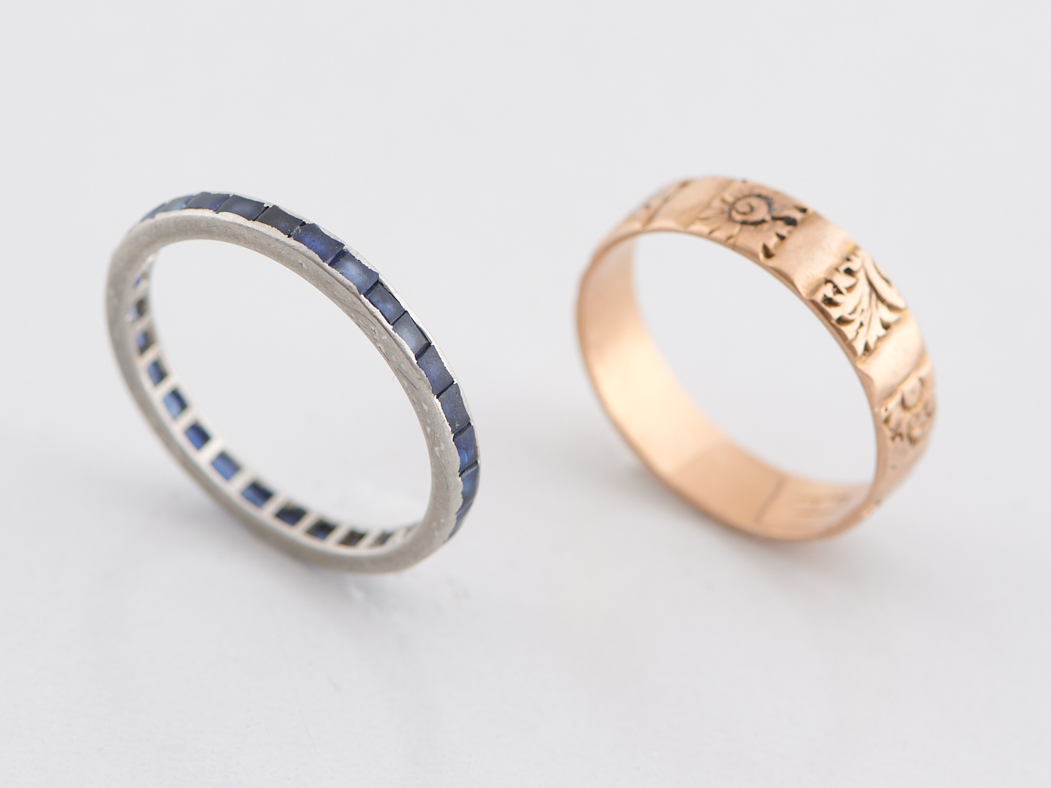 A SAPPHIRE BAND IN PLATINUM, SIZE P, 2.4GMS, TOGETHER WITH A 9CT GOLD BAND WITH LONDON HALLMARKS, SIZE N, 2.3GMS