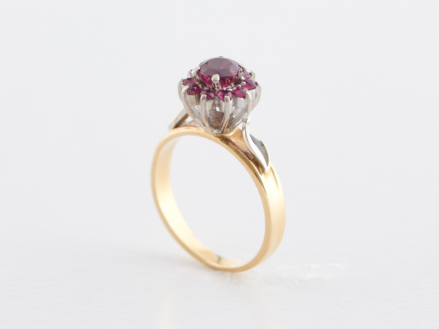 A VINTAGE RUBY CLUSTER RING IN 18CT GOLD AND PALLADIUM, THE CENTRING RUBY WEIGHING 0.45CTS, THE TEN SURROUNDING RUBIES TOTALLING 0.25CTS, RING SIZE I, WEIGHT 3.5GMS