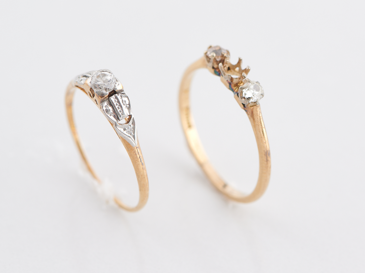 AN ANTIQUE DIAMOND RING IN 18CT GOLD, (1 DIAMOND DEFICIENT), THE DIAMONDS TOTALLING 0.26CTS, SIZE R, 2.2GMS, TOGETHER WITH AN ART DECO DIAMOND RING IN 18CT AND PLATINUM, THE CENTING DIAMOND WEIGHING 0.24 CTS, (THINNED BAND), SIZE Q, 1.8GMS