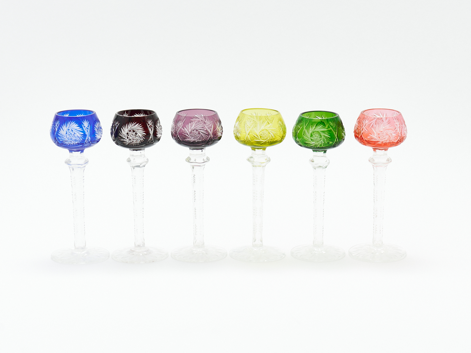 A HARLEQUIN SET OF SIX STEMMED LIQUEURS (A/F) H.13.5CM, LEONARD JOEL LOCAL DELIVERY: SMALL