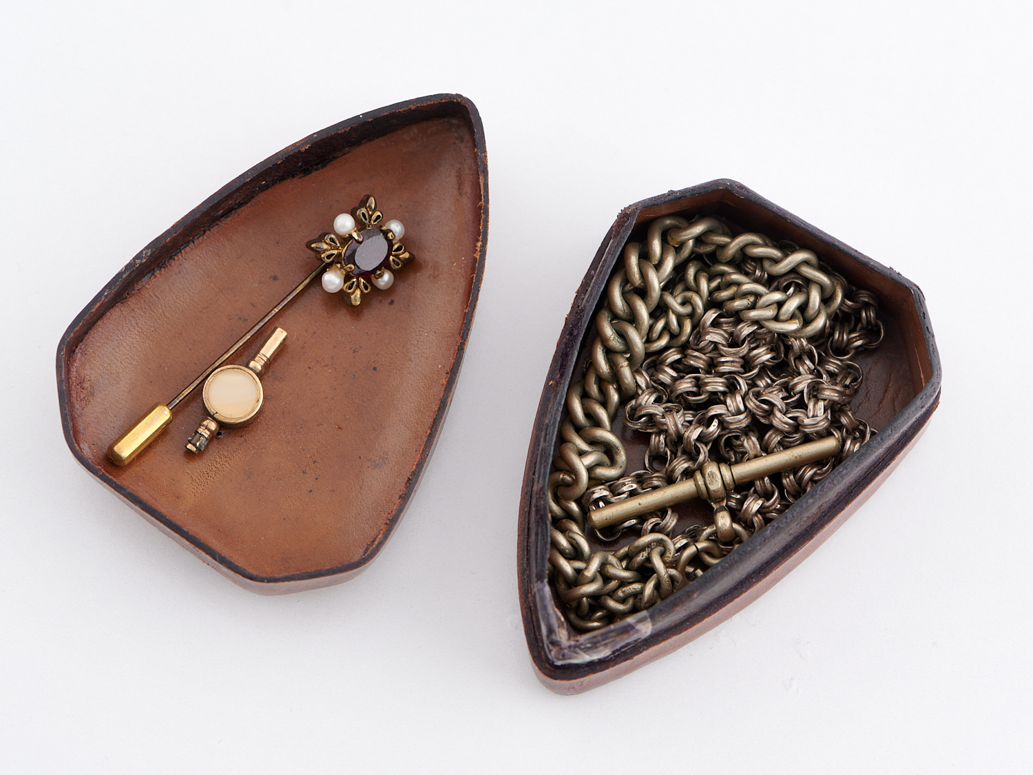 AN ANTIQUE ALBERT CHAIN AND POCKET WATCH KEY AND A GARNET AND PEARL STICKPIN, TOGETHER WITH AN ANTIQUE SILVER CHAIN A/F IN AN ITALIAN VINTAGE                                                                                                                                                         LEATHER BOX