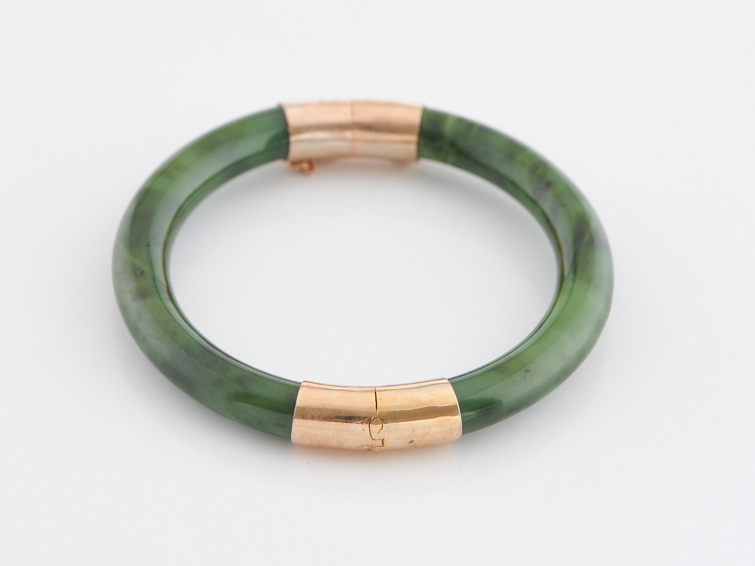 A VINTAGE NEPHRITE JADE HINGED BANGLE WITH GILDED HINGE AND CLASP SECTIONS, INNER DIAMETER 60MM
