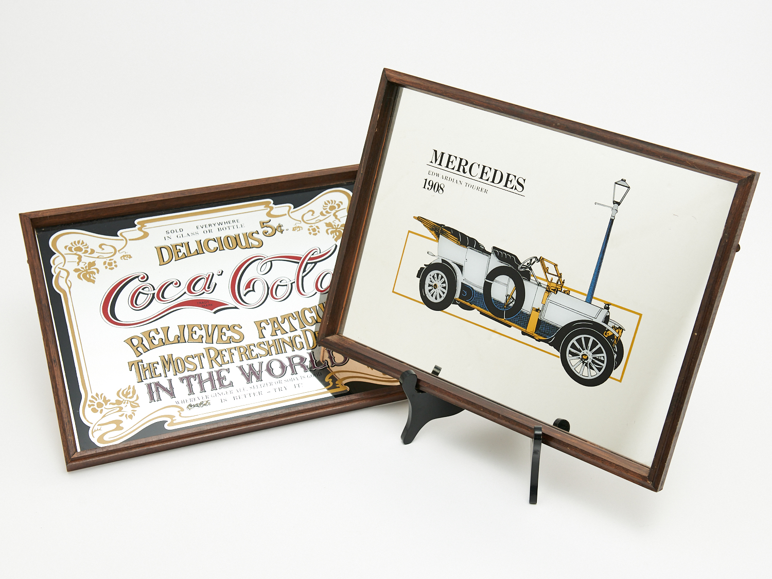 TWO WOODEN FRAMED ADVERTISING MIRRORS INCLUDING COCA-COLA AND MERCEDES, H.30CM X W.40CM, LEONARD JOEL LOCAL DELIVERY: MEDIUM