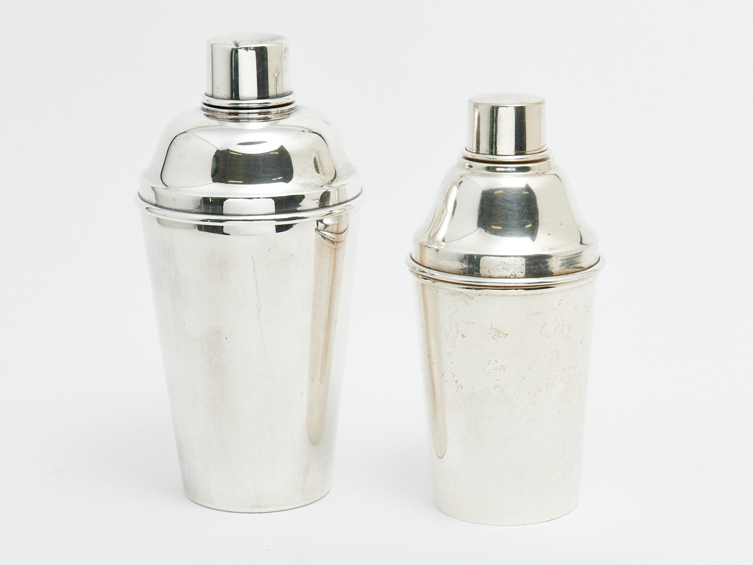 TWO VINTAGE ART DECO SILVER PLATE COCKTAIL SHAKERS, H.21.5CM (TALLEST), LEONARD JOEL LOCAL DELIVERY: SMALL