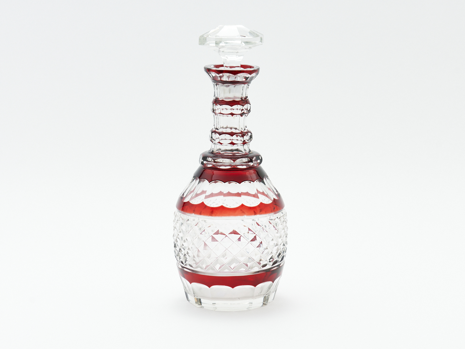 A RUBY CUT TO CLEAR THREE RING FACETED DECANTER, H.28CM, LEONARD JOEL LOCAL DELIVERY: MEDIUM
