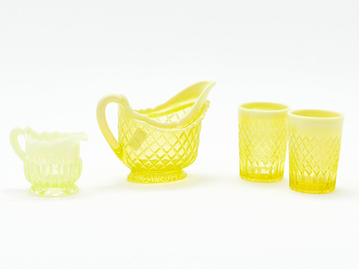 FOUR 19TH-CENTURY REGISTERED DAVIDSON URANIUM VASELINE JUGS AND TUMBLERS, W.13CM (LARGEST), LEONARD JOEL LOCAL DELIVERY: SMALL