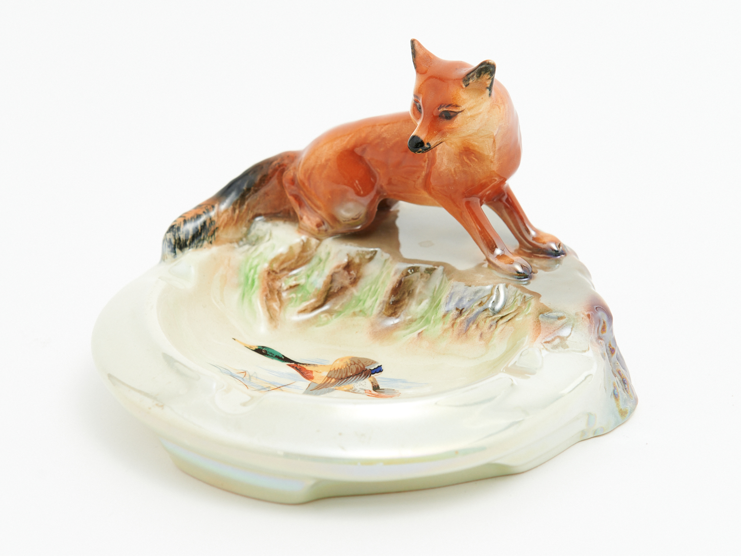 AN AUSTRALIAN WEMBLEY WARE FOX MOUNTED LUSTRE GLAZE ASHTRAY H.11CM X DIA.15.5CM, LEONARD JOEL LOCAL DELIVERY: SMALL