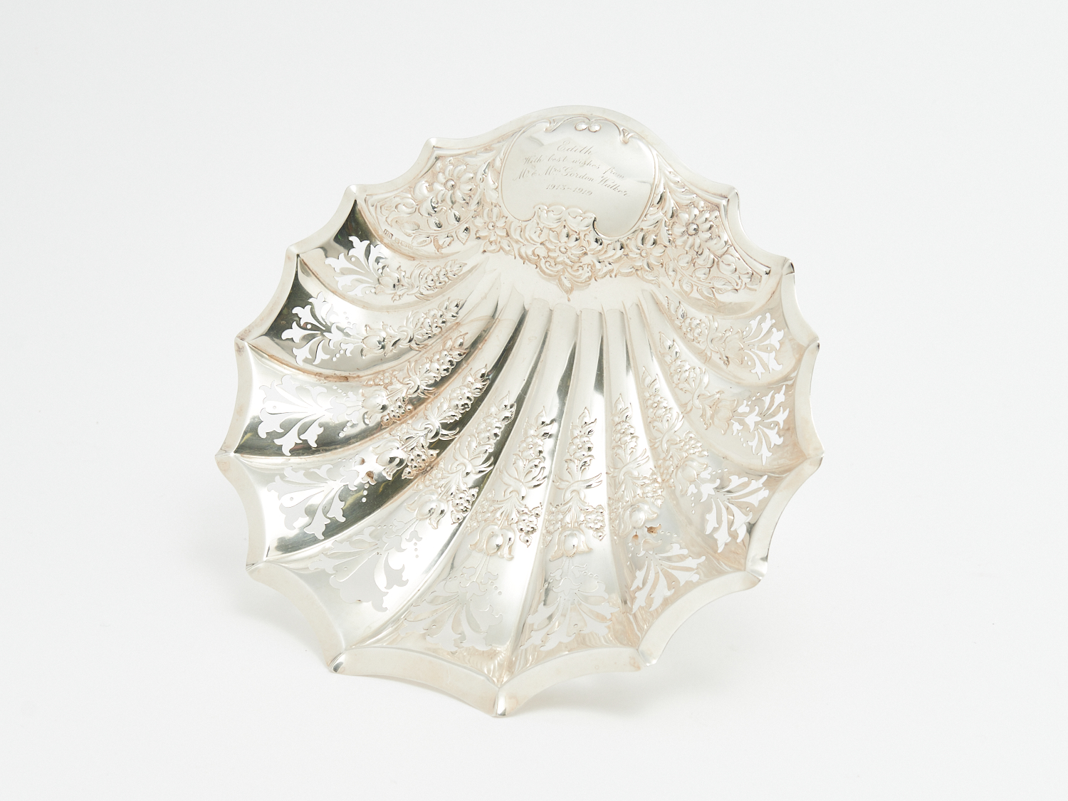 A STERLING SILVER SCALLOPED PIERCED AND FLORAL DECORATED BOWL SHEFFIELD 1919 - 322 GRAMS, DIA.26CM, LEONARD JOEL LOCAL DELIVERY: SMALL