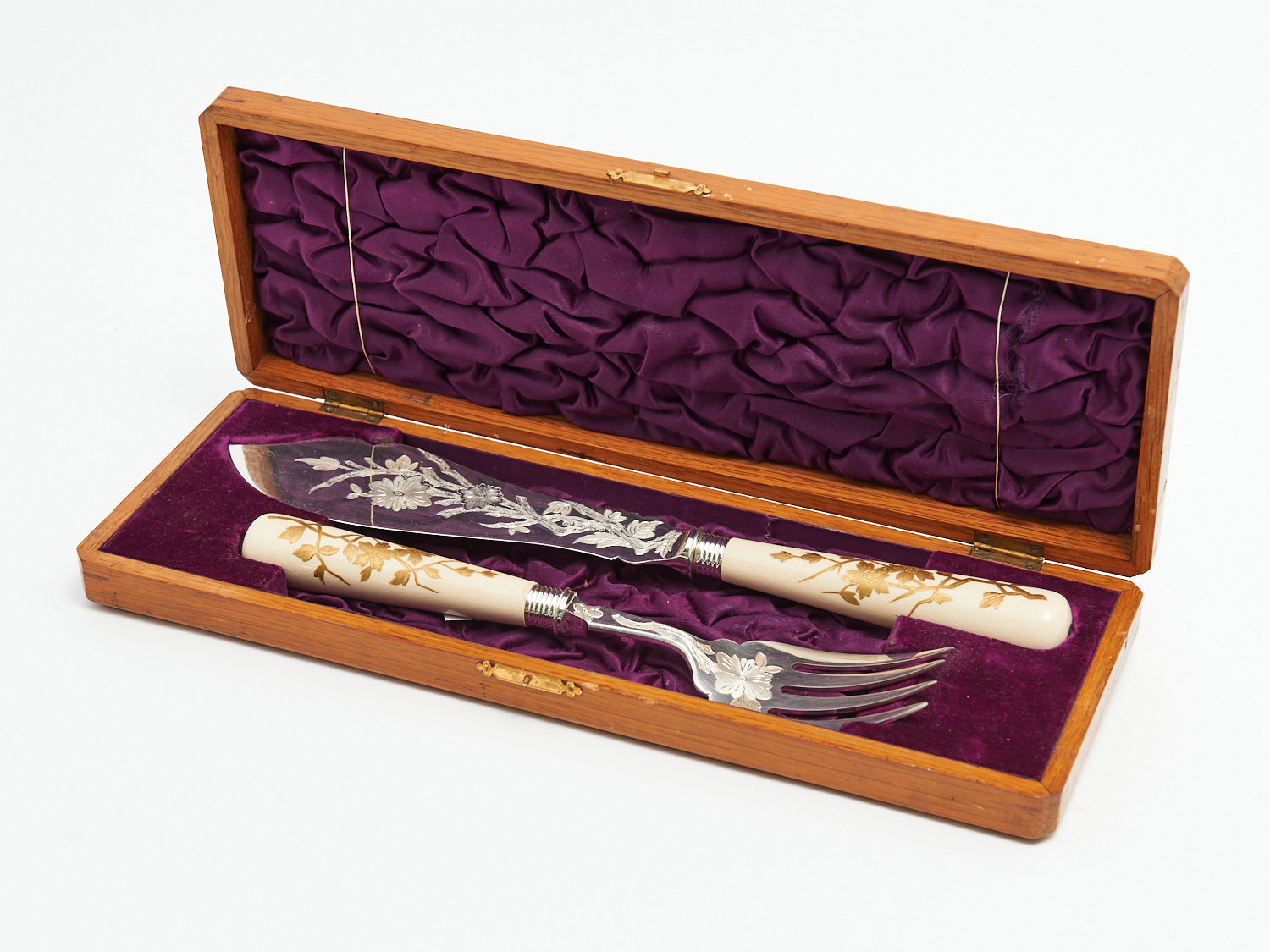 A CASED SET OF 19TH CENTURY ENGLISH PORCELAIN HANDLED SILVERPLATED ENGRAVED FISH SERVERS L.37.5CM, LEONARD JOEL LOCAL DELIVERY: SMALL