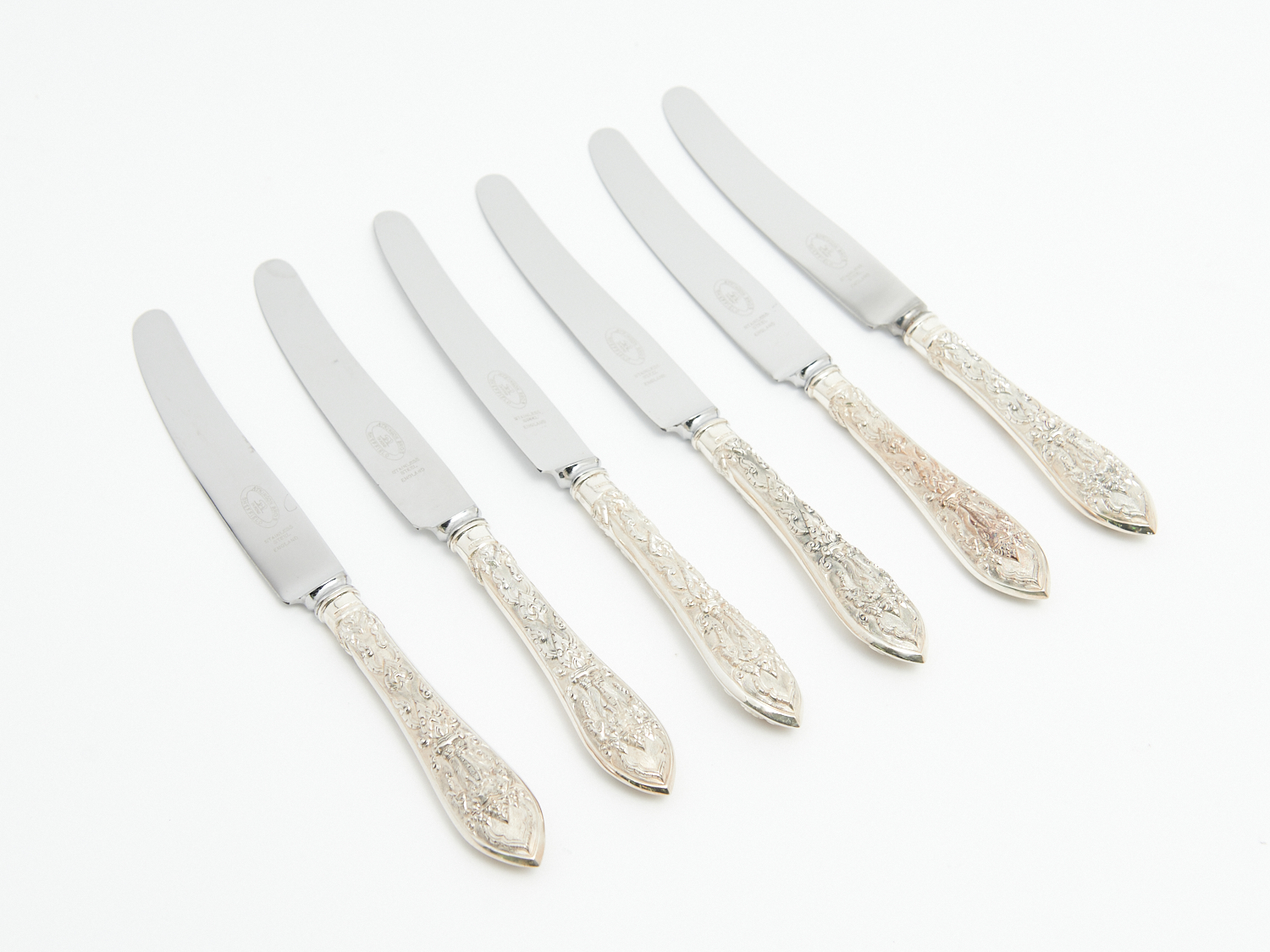 A SET OF SIX THAI 'STERLING' SILVER HANDLED DINNER KNIVES WITH ENGLISH SHEFFIELD STAINLESS STEEL BLADES L.25CM, LEONARD JOEL LOCAL DELIVERY: SMALL