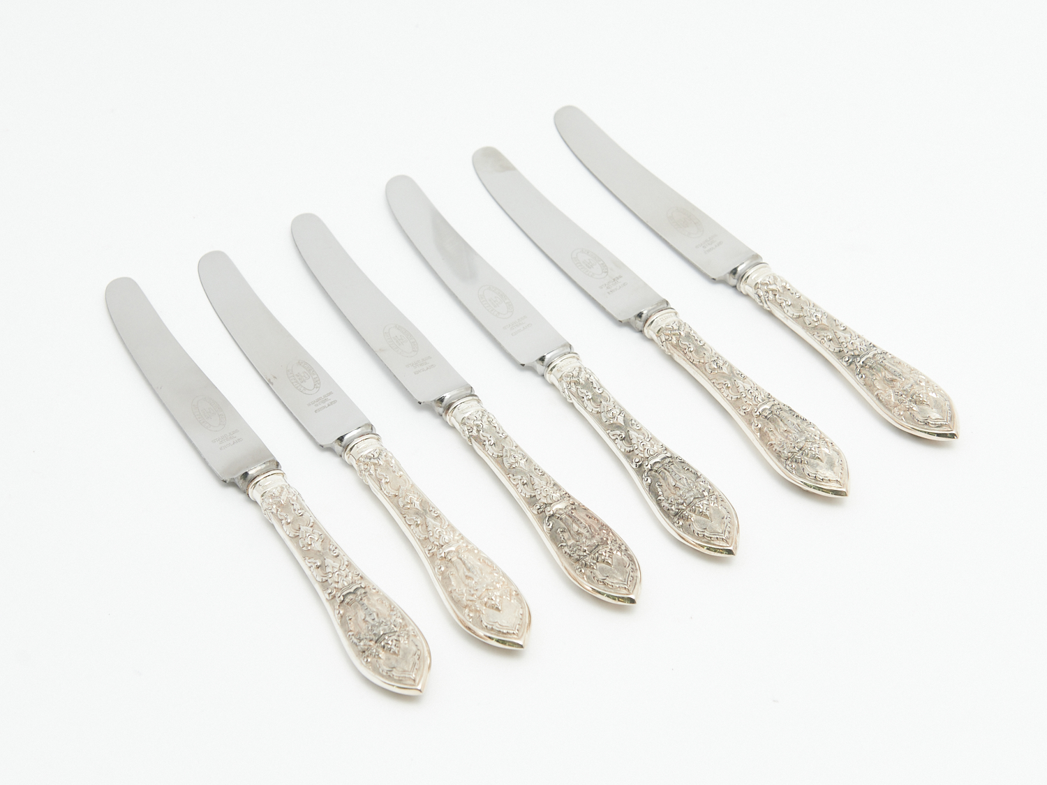 A SET OF SIX THAI 'STERLING' SILVER HANDLED ENTREE KNIVES WITH ENGLISH SHEFFIELD STAINLESS STEEL BLADES L.22.5CM, LEONARD JOEL LOCAL DELIVERY: SMALL