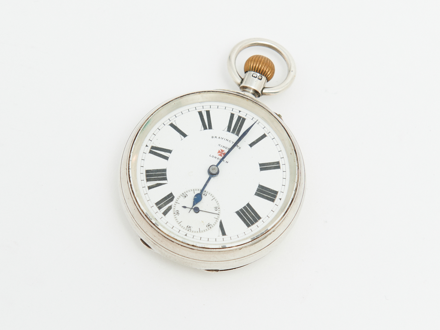 A STERLING SILVER CROWN WIND POCKET WATCH RETAILED BY BRAVINGTON'S KINGS LONDON (A/F), LEONARD JOEL LOCAL DELIVERY: SMALL