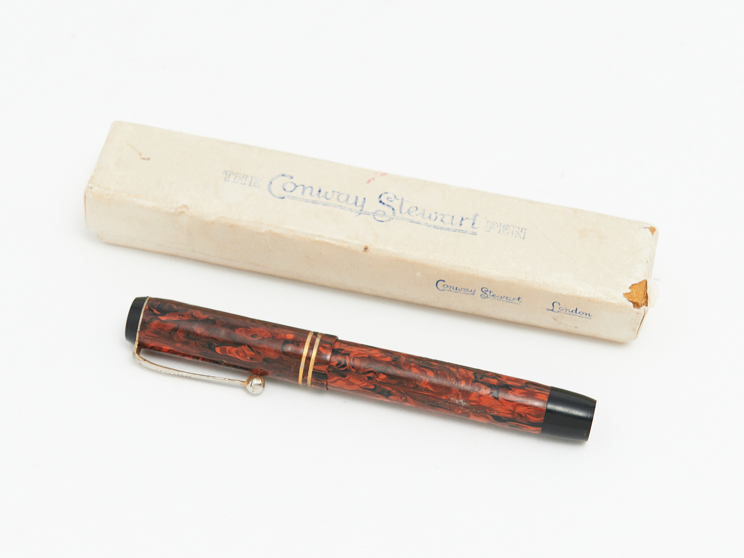A 1920S BOXED CONWAY STEWART MARBLED FOUNTAIN PEN WITH 14 CT GOLD NIB AND SIMILAR JACKER MARBLED RED FOUNTAIN PEN WITH 14 CARAT GOLD NIB, LEONARD JOEL LOCAL DELIVERY: SMALL