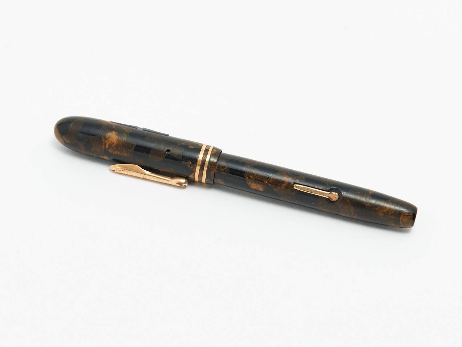A 1930S AMERICAN CONKLIN ENDURA SYMETRIK MARBLED FOUNTAIN PEN WITH 14CT GOLD NIB L.13.5CM, LEONARD JOEL LOCAL DELIVERY: SMALL