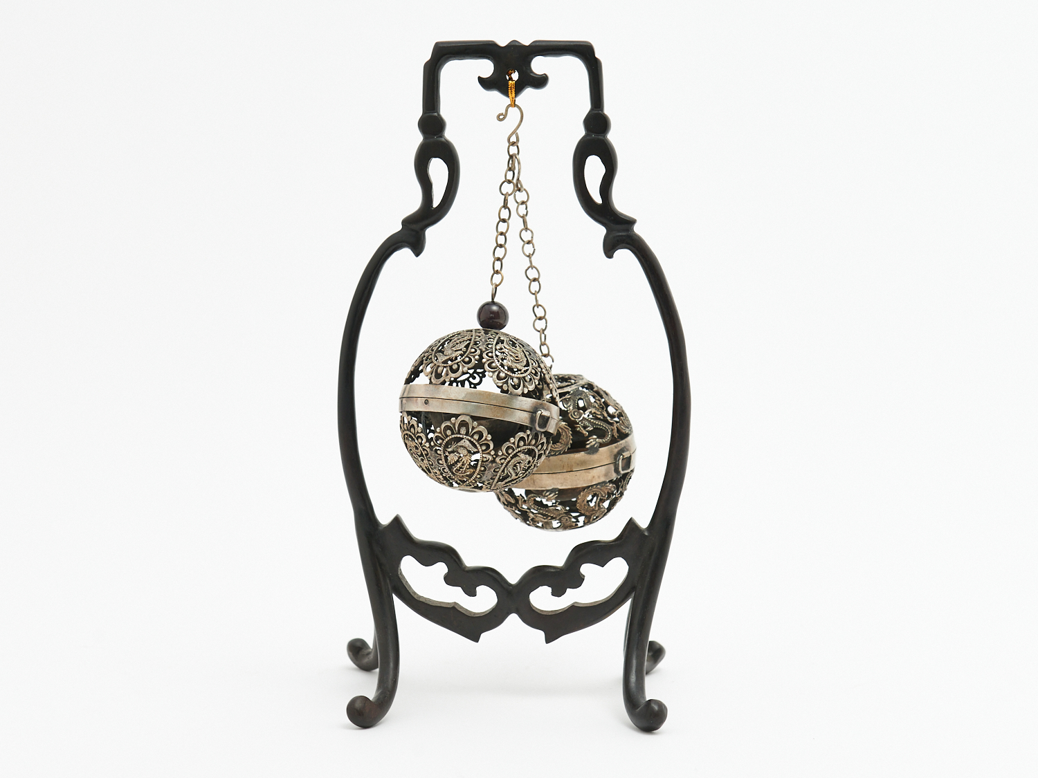 TWO CHINESE SILVER SPHERICAL INCENSE BURNERS H.26.5CM, LEONARD JOEL LOCAL DELIVERY: SMALL
