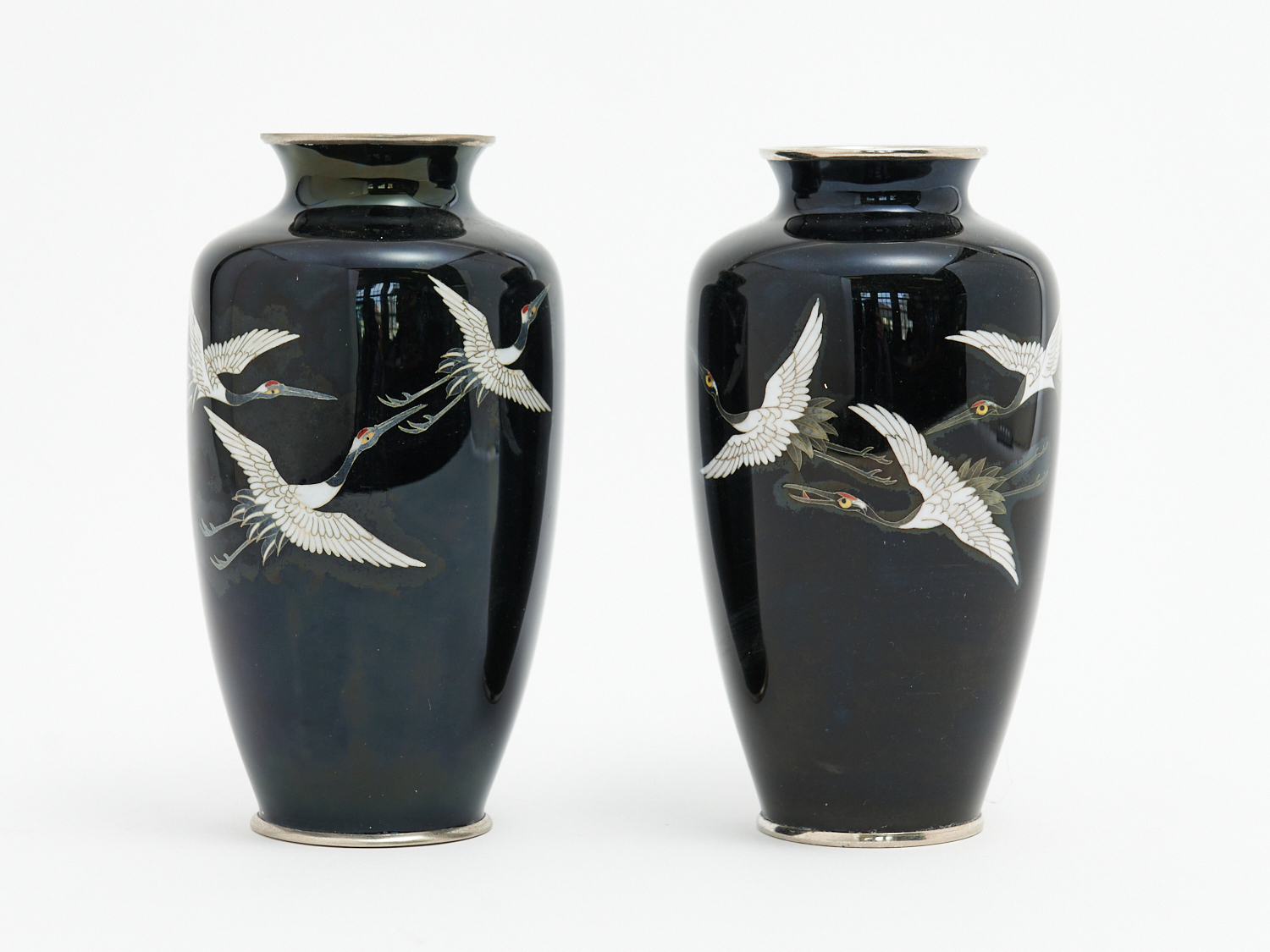 A PAIR OF JAPANESE BLACK GROUND CLOISONNE VASES WITH CRANE DECORATION H.18.5CM, LEONARD JOEL LOCAL DELIVERY: MEDIUM