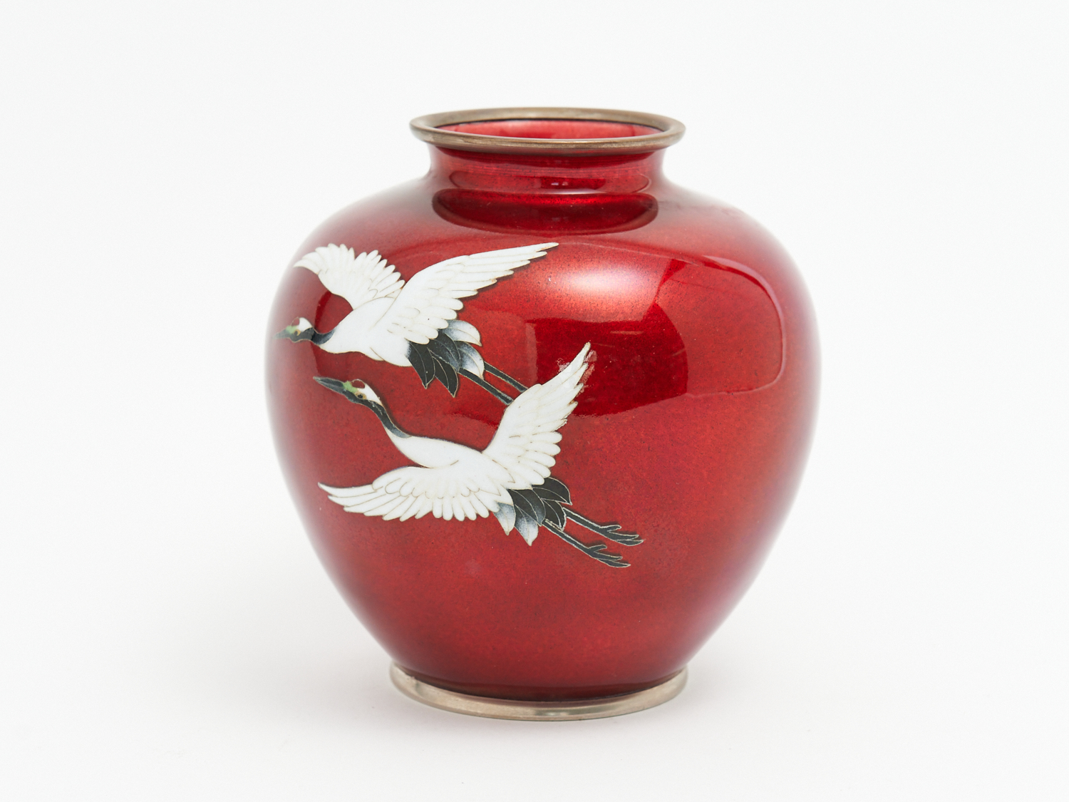 A JAPANESE RED GROUND CLOISONNE VASE WITH CRANES H.15.5CM, LEONARD JOEL LOCAL DELIVERY: SMALL