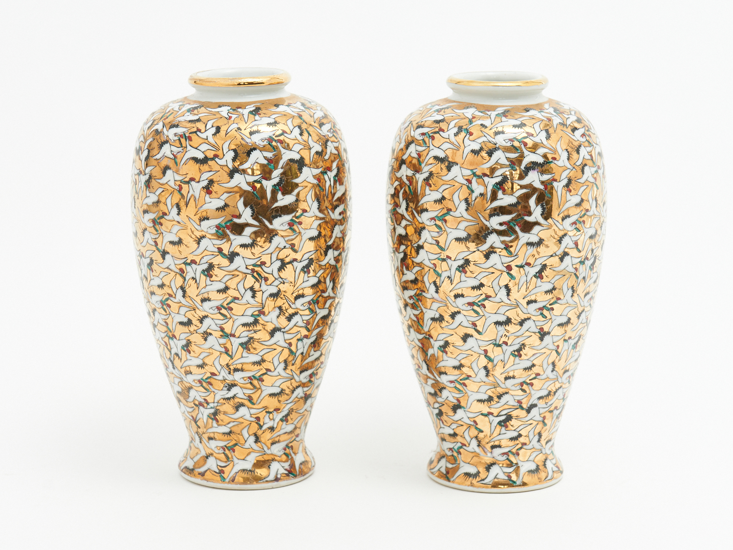 A PAIR OF JAPANESE KUTANI THOUSAND CRANE DECORATED VASES H.21CM, LEONARD JOEL LOCAL DELIVERY: MEDIUM