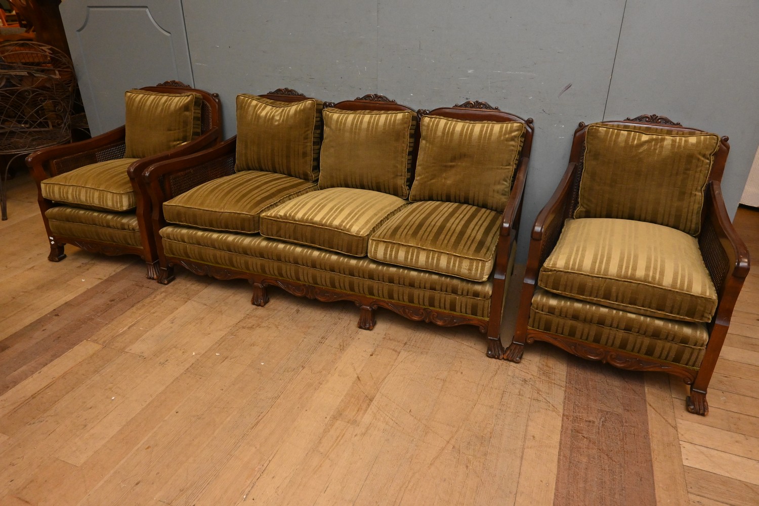 AN EARLY 20th CENTURY THREE-PIECE SUITE OF A SOFA AND PAIR OF ARMCHAIRS (A/F) ( 85H X 168W X 83D CM) ( PLEASE NOTE THIS HEAVY ITEM MUST BE REMOVED BY CLIENTS OR CARRIERS AT THE CUSTOMERS EXPENSE. LEONARD JOEL STAFF CANNOT ASSIST CARRYING THIS ITEM)