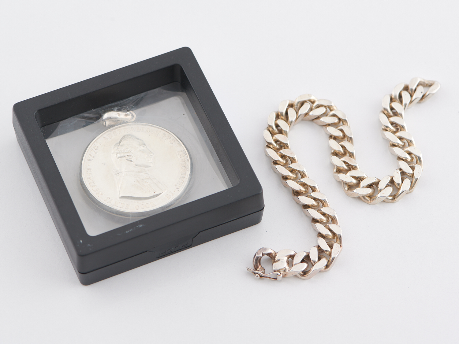 A HEAVY CURB LINK BRACELET IN STERLING SILVER, 220MM, TOGETHER WITH A 1970 SILVER COIN PENDANT, BOXED