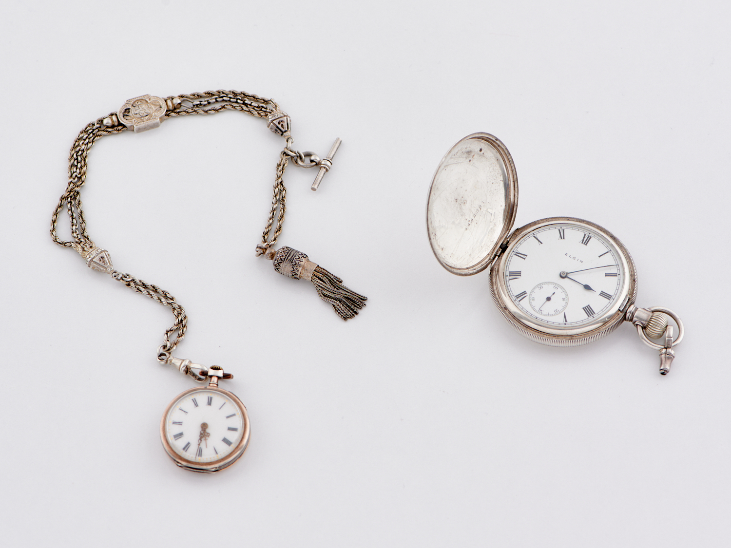 A LADIES SILVER OPENFACE POCKETWATCH, SWISS CYLINDER MOVEMENT, WITH DECORATIVE TRIPLE-STRAND ALBERTINA, CIRCA 1890, WATCH 30MM DIAMETER, WATCH CHAIN LENGTH 280MM AND ELGIN SILVER HUNTINGCASED POCKETWATCH, LEVER MOVEMENT, CIRCA 1900, 51MM DIAMETER.