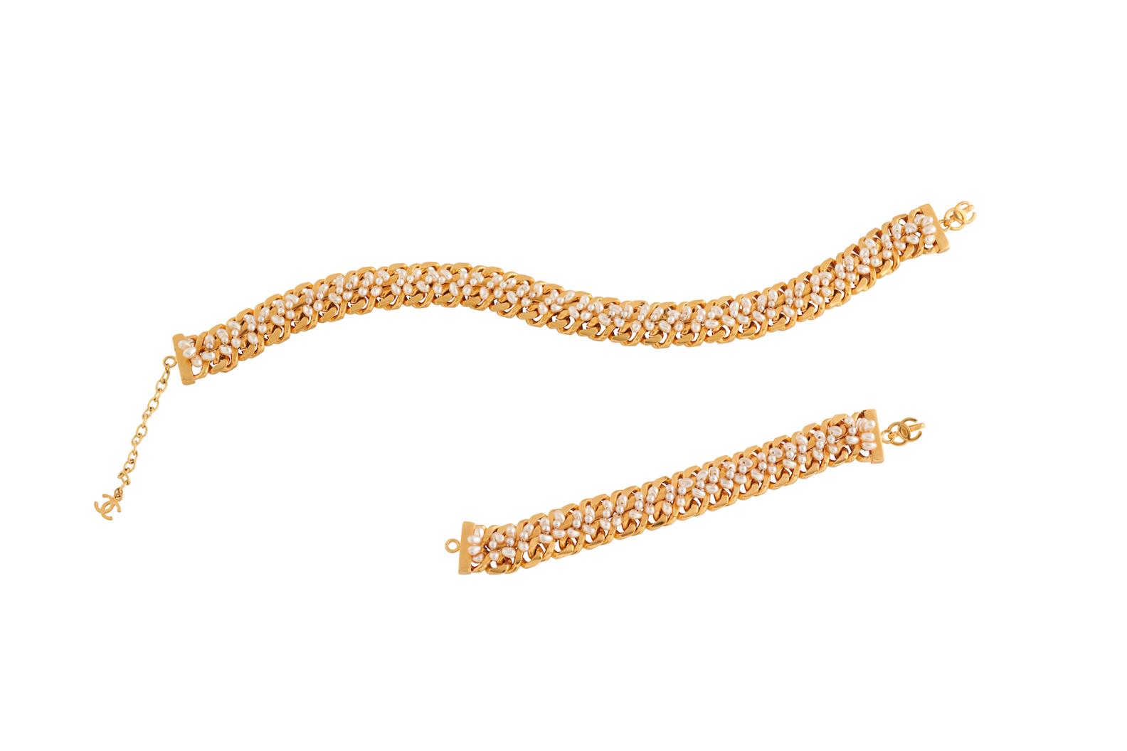 Comprising a double curb link collar set with faux rice pearls in gold tone metal, total length 400mm, with a conforming bracelet, total length 180mm.