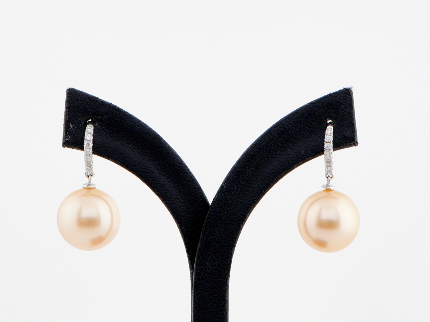A PAIR OF GOLDEN SOUTH SEA PEARL AND DIAMOND EARRINGS IN 18CT WHITE GOLD, THE PEARLS MEASURING 13MM, DIAMONDS TOTALLING 0.14CTS, TO SHEPHERD HOOK FITTINGS, LENGTH 27MM