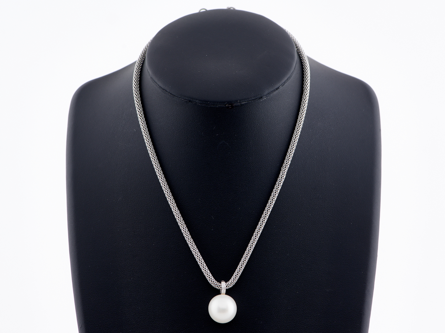 A PEARL AND DIAMOND PENDANT IN 9CT WHITE GOLD, THE PEARL MEASURING 15MM, LENGTH 22.7MM, TO A FANCY LINK DISPLAY CHAIN