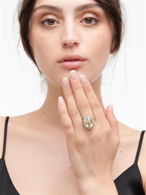 Of cluster design, centring a twelve claw-set oval-cut chrysoberyl weighing approximately 7.00 carats, within a surround of fourteen brilliant-cut diamonds together weighing approximately 1.70 carats, the underbezel detailed with thirty brilliant-cut black diamonds together weighing approximately 0.30 carats, size P.