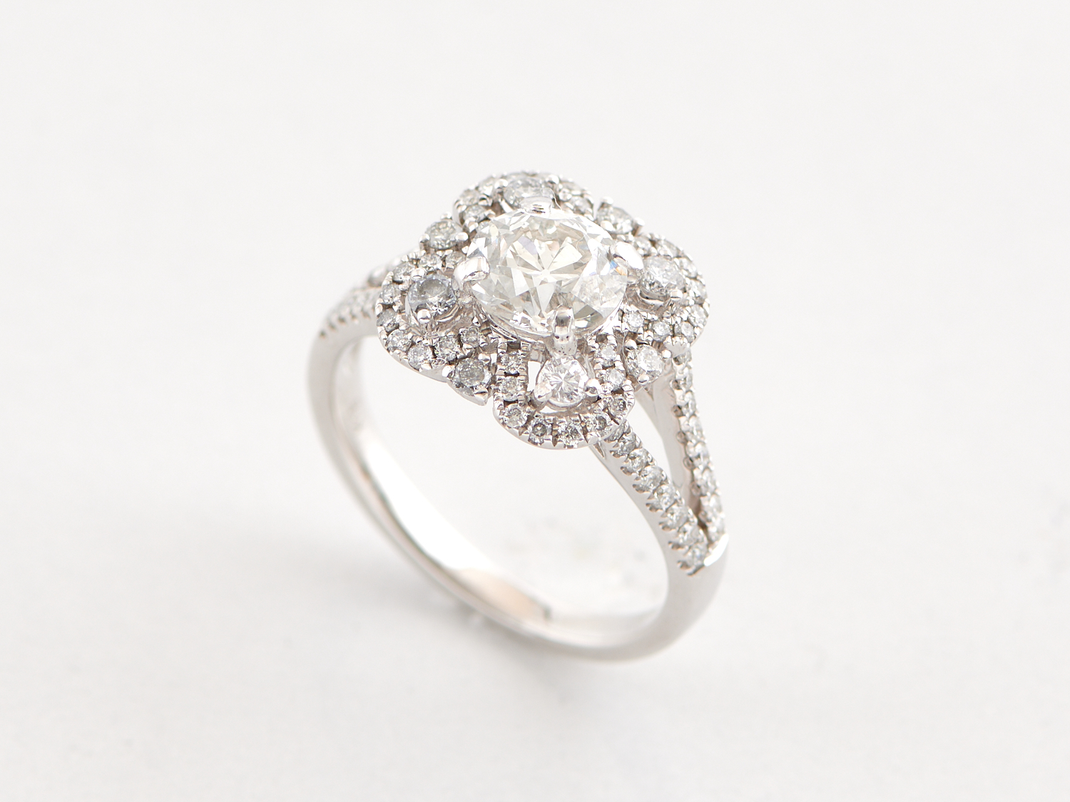 A DIAMOND SET RING IN 18CT WHITE GOLD, CENTRING A CLAW-SET OLD EUROPEAN-CUT DIAMOND WEIGHING 1.21 CARATS, WITHIN A DECORATIVE DIAMOND SURROUND WEIGHING 0.56 CARATS, RING SIZE M, WEIGHT 4.9GMS, WITH VALUATION